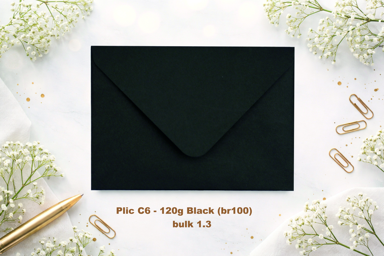 Plicurile C6 negre sunt realizate din hârtie offset colorată în masă (120 g/m²), oferind un aspect elegant și profesionist, ideal pentru corespondență business, invitații, prezentări sau materiale promoționale premium.